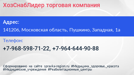 ХозСнабЛидер, торговая компания по адресу 141206, Московская область, Пушкино, Западная, 1а в дальнейшем Организация, размещена в следующих категориях: