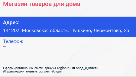 Магазин товаров для дома по адресу 141207, Московская область, Пушкино, Лермонтова, 2а в дальнейшем Организация, размещена в следующих категориях: