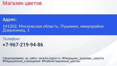 Магазин цветов по адресу 141202, Московская область, Пушкино, микрорайон Дзержинец, 1 в дальнейшем Организация, размещена в следующих категориях: