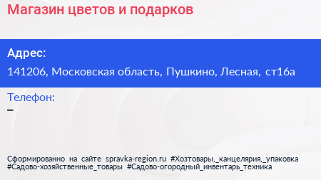 Магазин цветов и подарков по адресу 141206, Московская область, Пушкино, Лесная, ст16а в дальнейшем Организация, размещена в следующих категориях: