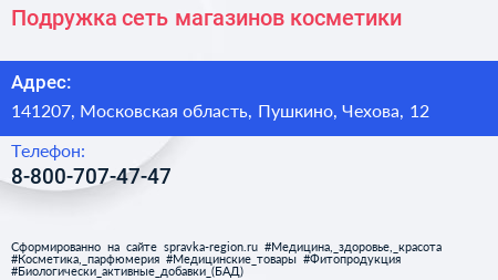 Подружка, сеть магазинов косметики по адресу 141207, Московская область, Пушкино, Чехова, 12 в дальнейшем Организация, размещена в следующих категориях:
