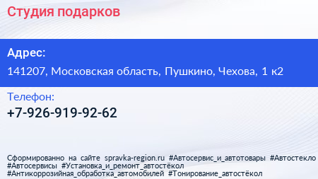 Студия подарков по адресу 141207, Московская область, Пушкино, Чехова, 1 к2 в дальнейшем Организация, размещена в следующих категориях: