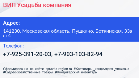ВИП Усадьба, компания по адресу 141230, Московская область, Пушкино, Боткинская, 33а ст4 в дальнейшем Организация, размещена в следующих категориях: