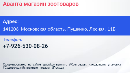 Аванта, магазин зоотоваров по адресу 141206, Московская область, Пушкино, Лесная, 11Б в дальнейшем Организация, размещена в следующих категориях: