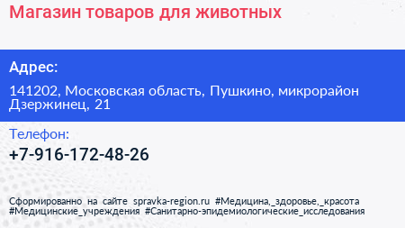 Магазин товаров для животных по адресу 141202, Московская область, Пушкино, микрорайон Дзержинец, 21 в дальнейшем Организация, размещена в следующих категориях: