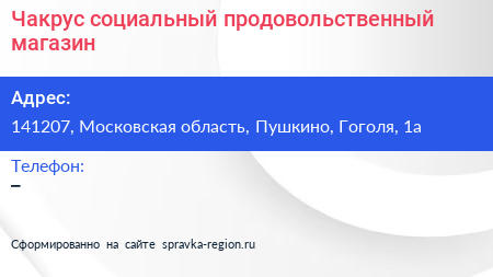 Чакрус, социальный продовольственный магазин по адресу 141207, Московская область, Пушкино, Гоголя, 1а в дальнейшем Организация, размещена в следующих категориях: