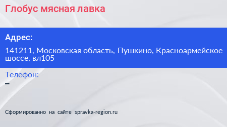 Глобус, мясная лавка по адресу 141211, Московская область, Пушкино, Красноармейское шоссе, вл105 в дальнейшем Организация, размещена в следующих категориях:
