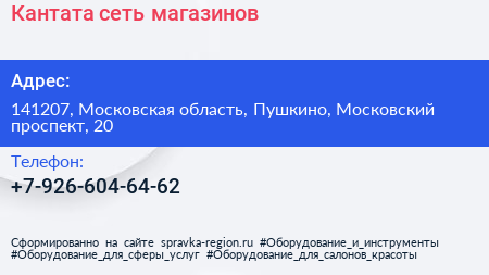 Кантата, сеть магазинов по адресу 141207, Московская область, Пушкино, Московский проспект, 20 в дальнейшем Организация, размещена в следующих категориях: