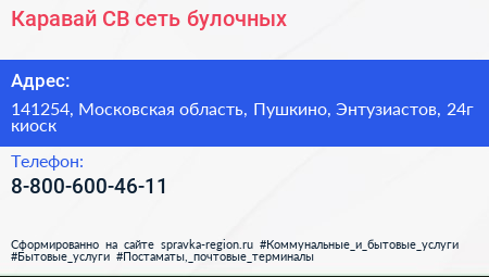 Каравай СВ, сеть булочных по адресу 141254, Московская область, Пушкино, Энтузиастов, 24г киоск в дальнейшем Организация, размещена в следующих категориях: