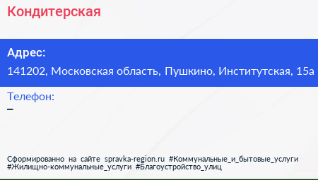 Кондитерская по адресу 141202, Московская область, Пушкино, Институтская, 15а в дальнейшем Организация, размещена в следующих категориях:
