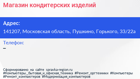 Магазин кондитерских изделий по адресу 141207, Московская область, Пушкино, Горького, 33/22а в дальнейшем Организация, размещена в следующих категориях: