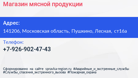 Магазин мясной продукции по адресу 141206, Московская область, Пушкино, Лесная, ст16а в дальнейшем Организация, размещена в следующих категориях: