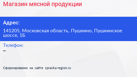 Магазин мясной продукции по адресу 141205, Московская область, Пушкино, Пушкинское шоссе, 1Б в дальнейшем Организация, размещена в следующих категориях: