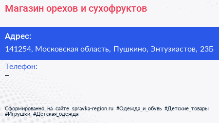 Магазин орехов и сухофруктов по адресу 141254, Московская область, Пушкино, Энтузиастов, 23Б в дальнейшем Организация, размещена в следующих категориях:
