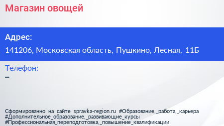 Магазин овощей по адресу 141206, Московская область, Пушкино, Лесная, 11Б в дальнейшем Организация, размещена в следующих категориях:
