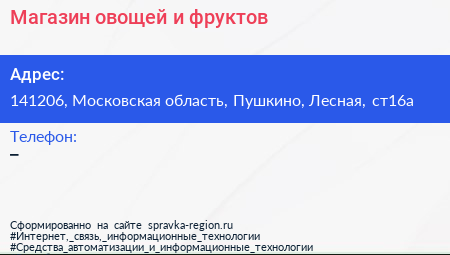 Магазин овощей и фруктов по адресу 141206, Московская область, Пушкино, Лесная, ст16а в дальнейшем Организация, размещена в следующих категориях: