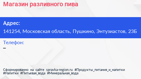 Магазин разливного пива по адресу 141254, Московская область, Пушкино, Энтузиастов, 23Б в дальнейшем Организация, размещена в следующих категориях: