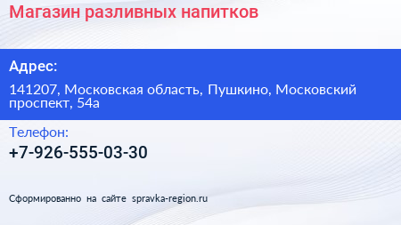Магазин разливных напитков по адресу 141207, Московская область, Пушкино, Московский проспект, 54а в дальнейшем Организация, размещена в следующих категориях: