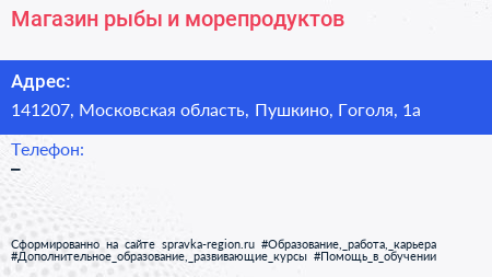 Магазин рыбы и морепродуктов по адресу 141207, Московская область, Пушкино, Гоголя, 1а в дальнейшем Организация, размещена в следующих категориях: