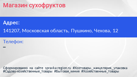 Магазин сухофруктов по адресу 141207, Московская область, Пушкино, Чехова, 12 в дальнейшем Организация, размещена в следующих категориях: