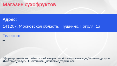 Магазин сухофруктов по адресу 141207, Московская область, Пушкино, Гоголя, 1а в дальнейшем Организация, размещена в следующих категориях: