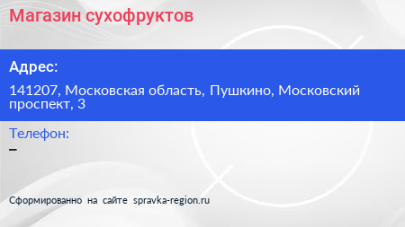 Магазин сухофруктов по адресу 141207, Московская область, Пушкино, Московский проспект, 3 в дальнейшем Организация, размещена в следующих категориях: