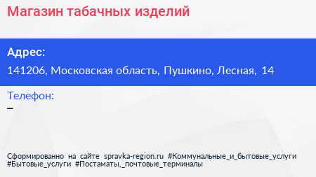 Магазин табачных изделий по адресу 141206, Московская область, Пушкино, Лесная, 14 в дальнейшем Организация, размещена в следующих категориях: