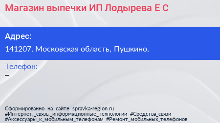 Магазин выпечки, ИП Лодырева Е.С. по адресу 141207, Московская область, Пушкино, в дальнейшем Организация, размещена в следующих категориях: