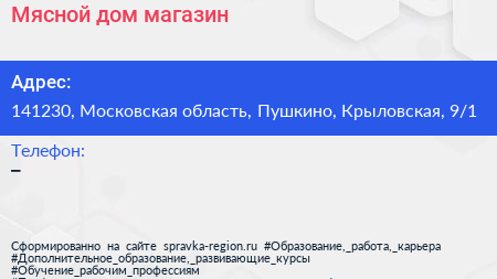 Мясной дом, магазин по адресу 141230, Московская область, Пушкино, Крыловская, 9/1 в дальнейшем Организация, размещена в следующих категориях: