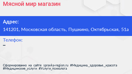 Мясной мир, магазин по адресу 141201, Московская область, Пушкино, Октябрьская, 51а в дальнейшем Организация, размещена в следующих категориях: