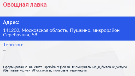 Овощная лавка по адресу 141202, Московская область, Пушкино, микрорайон Серебрянка, 58 в дальнейшем Организация, размещена в следующих категориях: