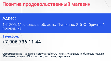 Позитив, продовольственный магазин по адресу 141205, Московская область, Пушкино, 2-й Фабричный проезд, 7а в дальнейшем Организация, размещена в следующих категориях:
