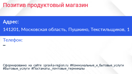 Позитив, продуктовый магазин по адресу 141201, Московская область, Пушкино, Текстильщиков, 1 в дальнейшем Организация, размещена в следующих категориях:
