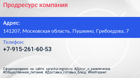 Продресурс, компания по адресу 141207, Московская область, Пушкино, Грибоедова, 7 в дальнейшем Организация, размещена в следующих категориях: