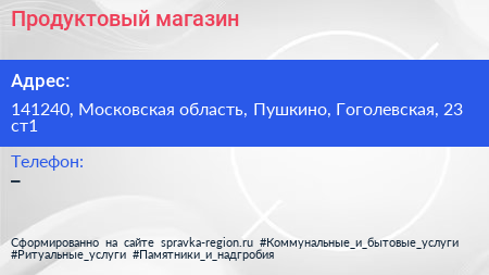 Продуктовый магазин по адресу 141240, Московская область, Пушкино, Гоголевская, 23 ст1 в дальнейшем Организация, размещена в следующих категориях: