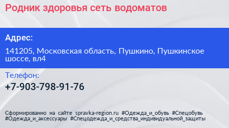 Родник здоровья, сеть водоматов по адресу 141205, Московская область, Пушкино, Пушкинское шоссе, вл4 в дальнейшем Организация, размещена в следующих категориях: