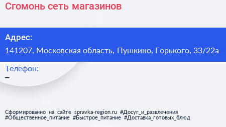 Сгомонь, сеть магазинов по адресу 141207, Московская область, Пушкино, Горького, 33/22а в дальнейшем Организация, размещена в следующих категориях: