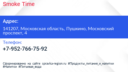 Smoke Time по адресу 141207, Московская область, Пушкино, Московский проспект, 4 в дальнейшем Организация, размещена в следующих категориях: