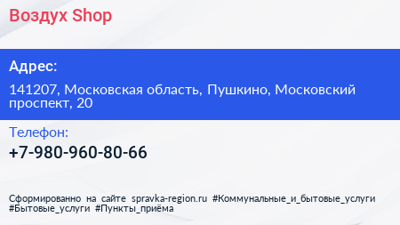 Воздух Shop по адресу 141207, Московская область, Пушкино, Московский проспект, 20 в дальнейшем Организация, размещена в следующих категориях: