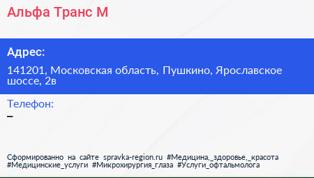 Альфа Транс М по адресу 141201, Московская область, Пушкино, Ярославское шоссе, 2в в дальнейшем Организация, размещена в следующих категориях: