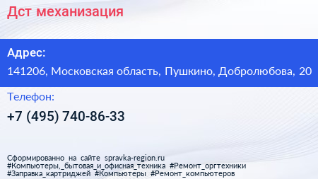 Дст-механизация по адресу 141206, Московская область, Пушкино, Добролюбова, 20 в дальнейшем Организация, размещена в следующих категориях: