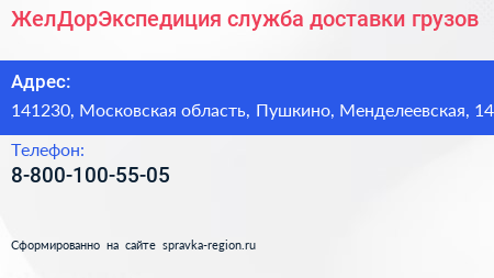 ЖелДорЭкспедиция, служба доставки грузов по адресу 141230, Московская область, Пушкино, Менделеевская, 14 в дальнейшем Организация, размещена в следующих категориях: