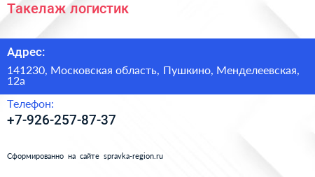 Такелаж логистик по адресу 141230, Московская область, Пушкино, Менделеевская, 12а в дальнейшем Организация, размещена в следующих категориях: