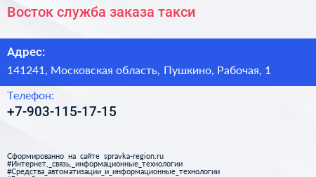 Восток, служба заказа такси по адресу 141241, Московская область, Пушкино, Рабочая, 1 в дальнейшем Организация, размещена в следующих категориях: