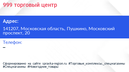 999!, торговый центр по адресу 141207, Московская область, Пушкино, Московский проспект, 20 в дальнейшем Организация, размещена в следующих категориях:
