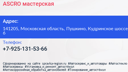 ASCRO, мастерская по адресу 141205, Московская область, Пушкино, Кудринское шоссе, 6 в дальнейшем Организация, размещена в следующих категориях: