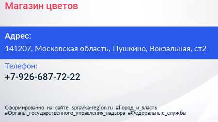 Магазин цветов по адресу 141207, Московская область, Пушкино, Вокзальная, ст2 в дальнейшем Организация, размещена в следующих категориях: