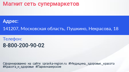 Магнит, сеть супермаркетов по адресу 141207, Московская область, Пушкино, Некрасова, 18 в дальнейшем Организация, размещена в следующих категориях:
