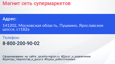 Магнит, сеть супермаркетов по адресу 141202, Московская область, Пушкино, Ярославское шоссе, ст182а в дальнейшем Организация, размещена в следующих категориях: