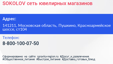 SOKOLOV, сеть ювелирных магазинов по адресу 141211, Московская область, Пушкино, Красноармейское шоссе, ст104 в дальнейшем Организация, размещена в следующих категориях: